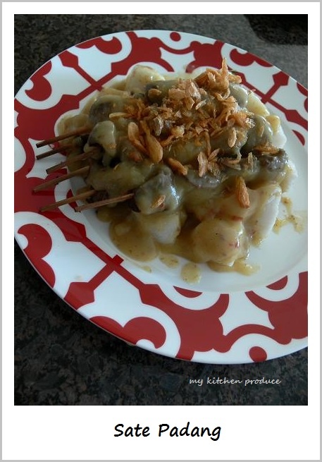 Sate Padang is originated from West Sumatra. The meat used to make the satay are taken from cow and buffalo, that includes some of the edible organs (not too sure what they are though) and possibly a non edible one (don’t wanna know what they are). The different between this particular satay and any other satay is that the meat and internal organs are marinated and boiled until tender and well done, then they are stuck in the bamboo skewer (traditionally they used the midrib of the coconut leaf). The satay then grilled on the charcoal and serve on top of banana leaves with thickened gravy sauce made from the stock of the marinated herb. They are best served with rice cake (known as ketupat) and topped off with fried shallot.