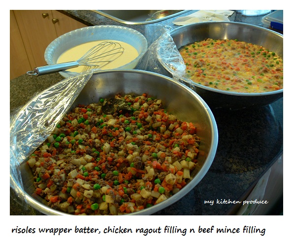 Well, after I arrived home, I can’t really start my cooking straight away since my little boy was still awake. I had to wait until he went to bed first. Well that was my thought originally. After he slept, I didn’t really go straight to the kitchen. I had my intimate time with my laptop and was doing facebook-ing time. Harvesting my online crops and feeding my virtual animals. Well enough said for that, time is ticking. It was around 11 PM at night. I took out the cutting board and start cutting and cubing 1 kg of carrot and 2 kg of potatoes. I know it was a bit too much for 54 risoles, but I don’t want to take any chances if something happens. I better have more than enough filling rather than less. I finished about 2 AM in the morning cooking all the beef mince and chicken ragout filling. Clean the kitchen so I feel happy to start working in the morning.
